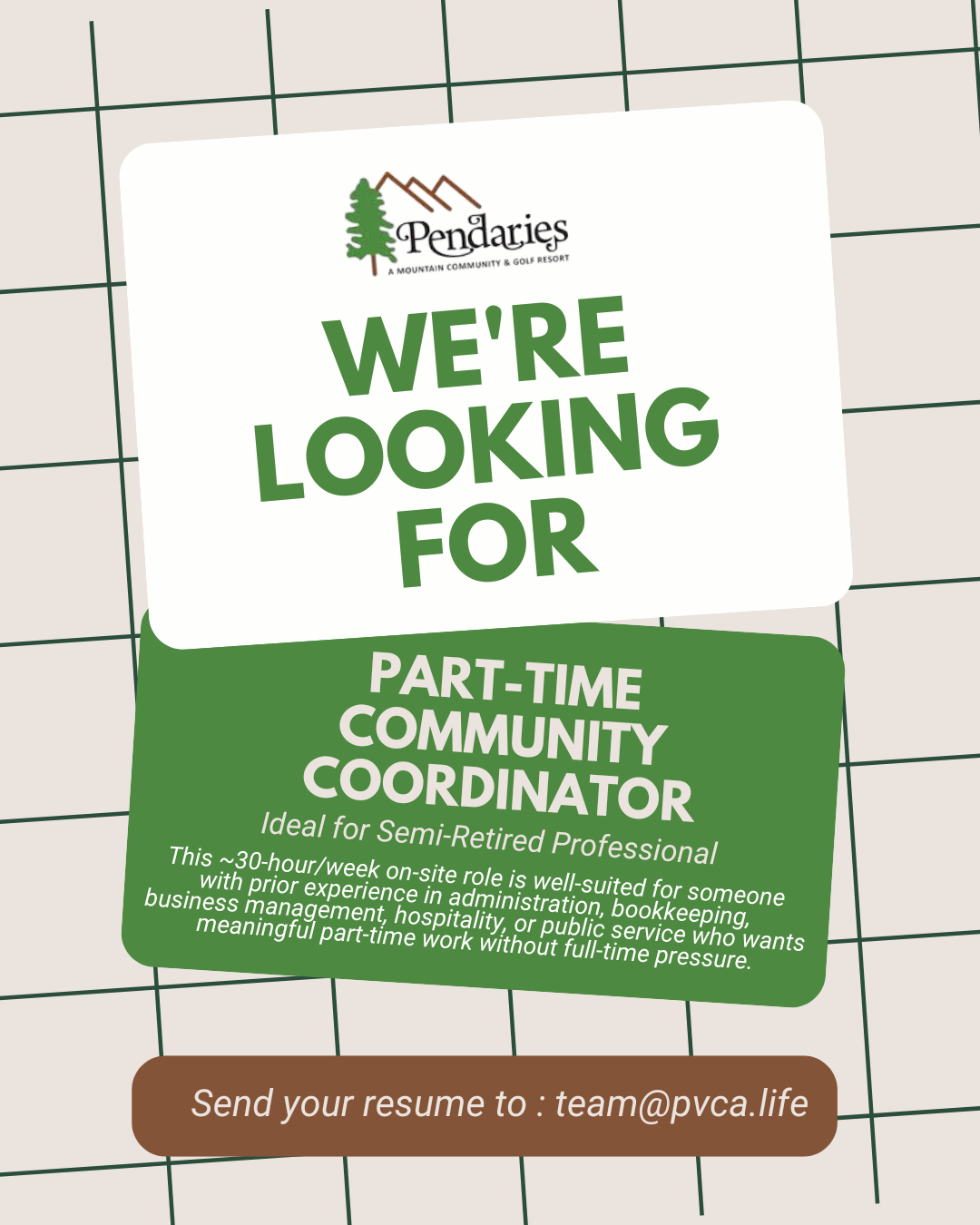 Pendaries is owned and managed by the Pendaries Village Community Association (PVCA). The members of the PVCA include all property owners within Pendaries Village. The PVCA Board of Directors is elected by the PVCA members.